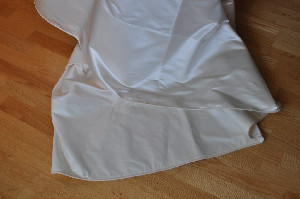 I used the skirt pattern as is, just adjusted the train length. I used duchess silk satin, and it’s unlined. I made a wide hem facing and used a velvet ribbon as a brush braid.