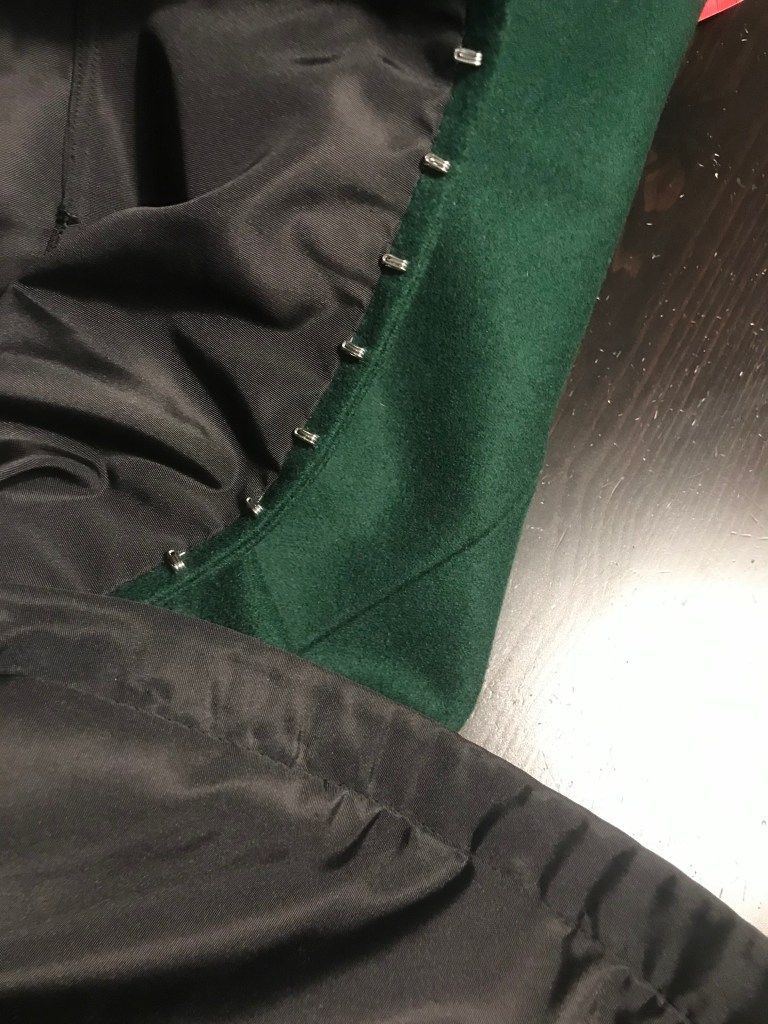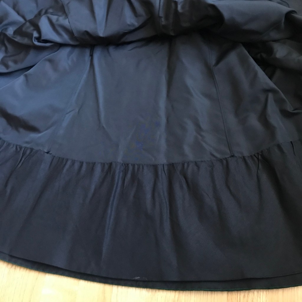 However, to get the shape just right, I had to make several fittings and changes to the mock-up and was about to despair. But the end result was worth it. Here’s the skirt with foundation skirt but not yet hemmed or having a waistband or closures: