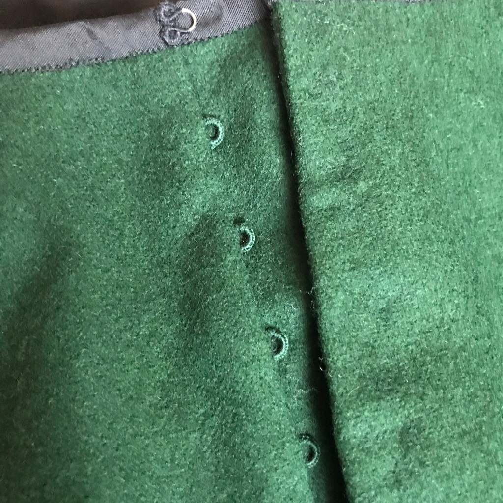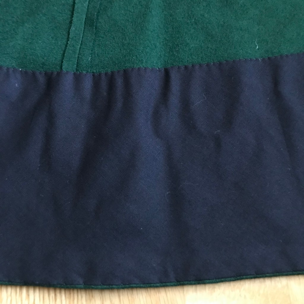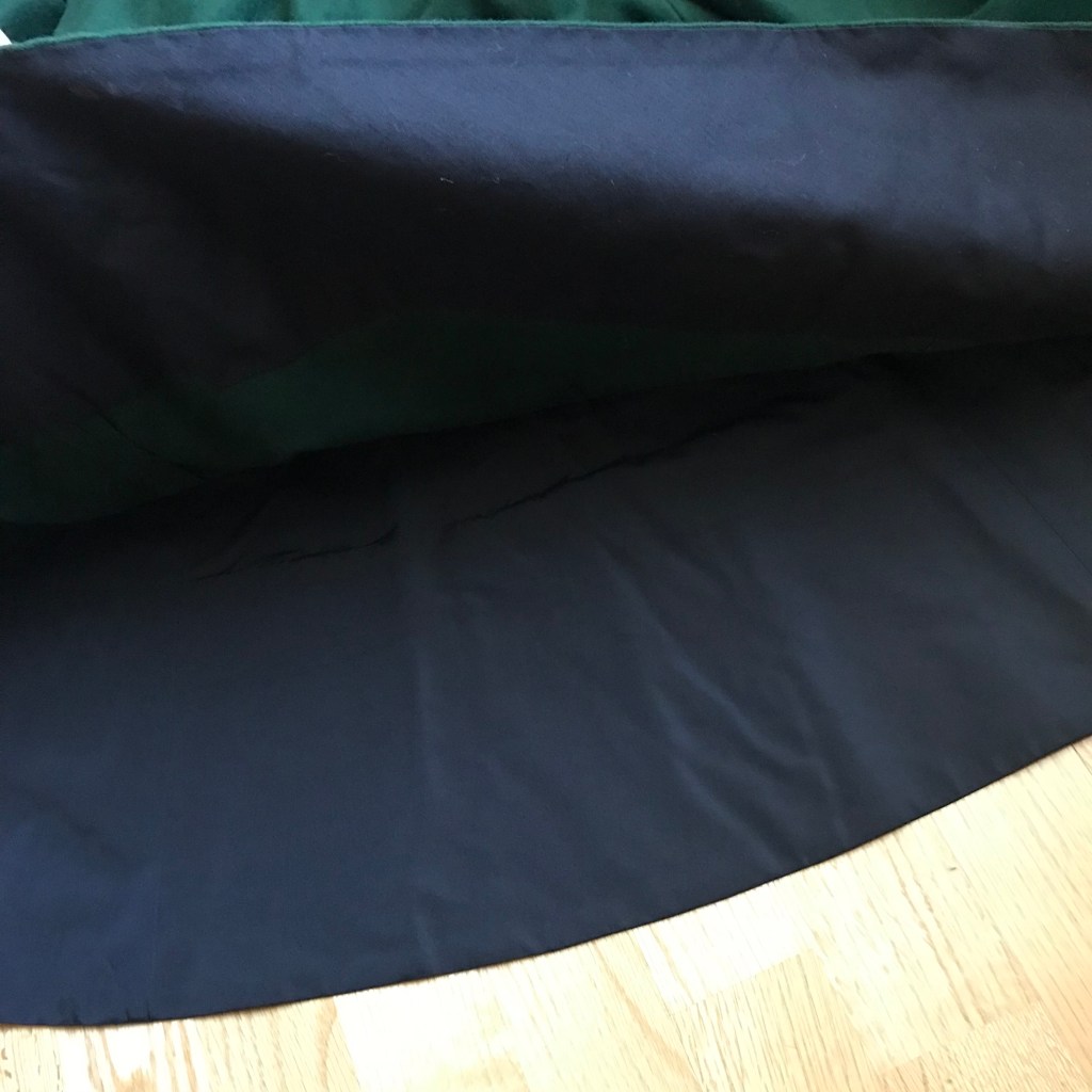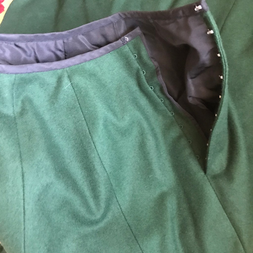 The skirt is unlined, but it has a silk taffeta foundation skirt of the same shape sewn into one waistband, so the foundation skirt is acting like a lining. Both the wool and the taffeta have wide facings made of plain cotton.
